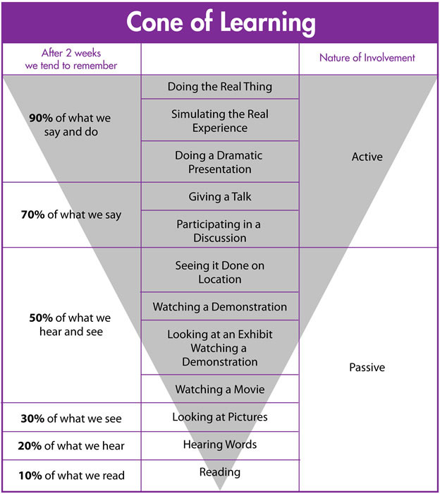 The book is put together in an interesting way – Kiyosaki himself admits that he isn’t the best writer – but when you read ‘Rich Dad Poor Dad’ you essentially read the book 3 times in 3 slightly different ways. The first is of Roberts lessons that he learned from his rich dad and his poor dad; the second is a summary of the previous chapter, essentially going over the previous chapter in a more condensed way and the third is the study section. This encourages discussion and reflection upon what you have just read. An unusual way of reading and whilst it could come across as lazy writing, I think that Kiyosaki is very deliberately structuring the content in a way the encourages learning retention through repetition. He also brushes past the concept of Edgar Dale’s “Cone of Experience” early on which I think helps add some context to this style of revisiting content.